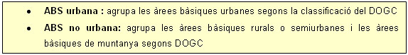 Per tant en l’anàlisi de la qualitat de l’assistència a les persones amb diabetis s’ha diferenciat entre les ABS d’àmbit urbà respecte a les ABS d’àmbit no urbà .Per la classificació de les ABS s’ha tingut en compte la diferenciació que fa el Diari Oficial de la Generalitat de Catalunya (DOGC, número 3629 ) (23) de les totes les àrees bàsiques de salut (ABS), distribuïdes en 2 grups: